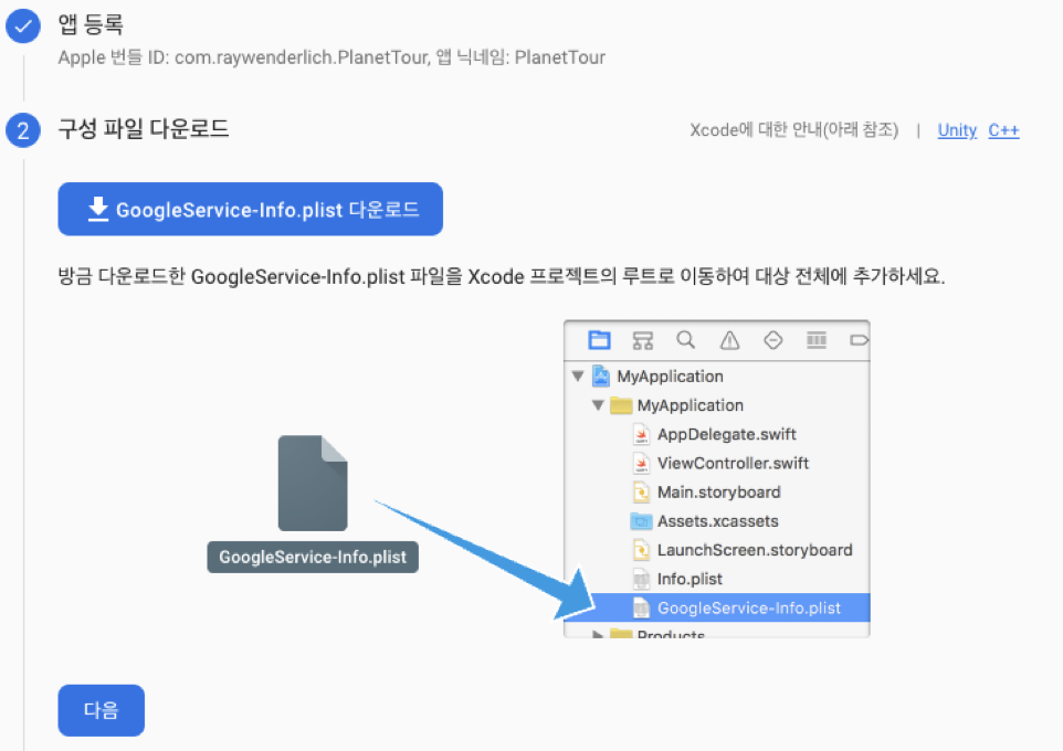 파이어베이스에서 제공하는 GoogleService-info.plist를 다운로드 받아 프로젝트에 적용해줍니다.
