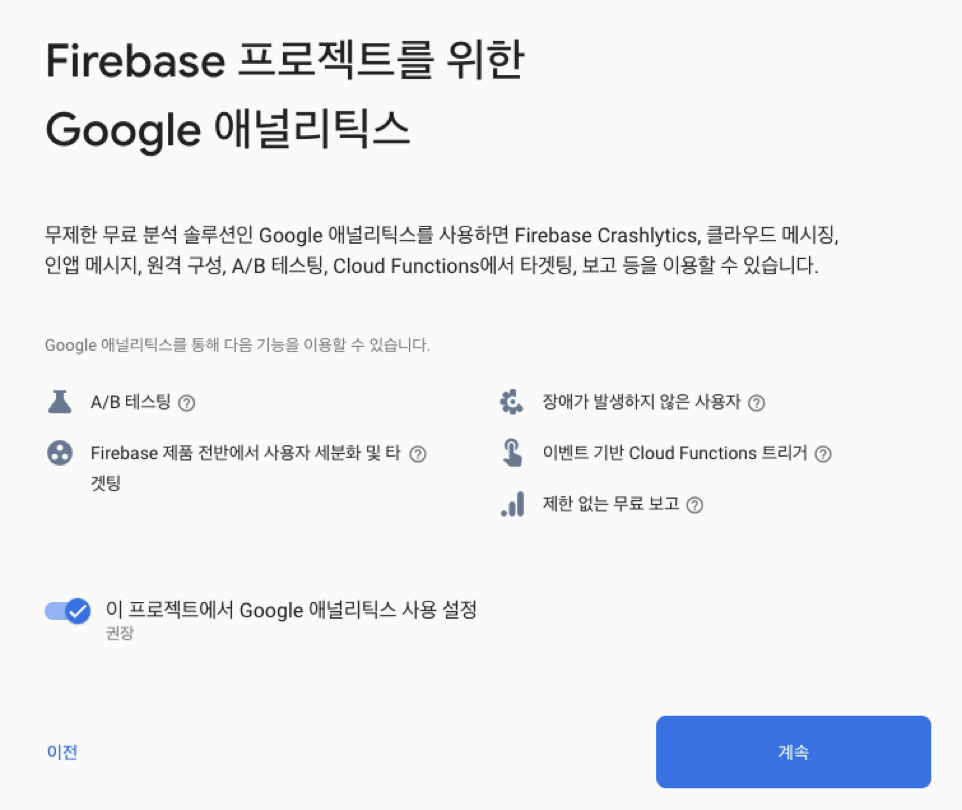 위의 링크를 누르면 Firebase 콘솔로 이동하게 됩니다.