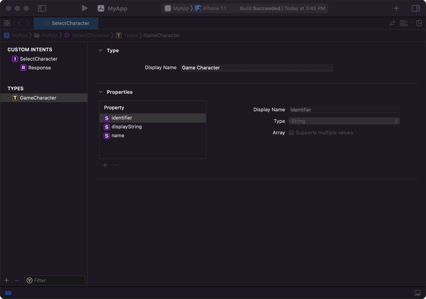 위에서 정의한 프로퍼티 리스트를 동적으로 보여주기 위해서 IntentsExtension을 추가해줘야 한다.