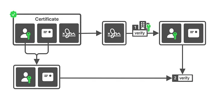 각 Certificate가 상위 node의 sign을 받아 마지막 노드에서 sign을 받으면서 인증 절차를 수행한다.