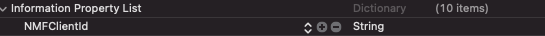 프로젝트 파일을 열어서 Info.plist에서 NMFClient를 키로 추가하고 값으로 복사한 Client ID를 넣어주면 초기 설정은 모두 끝이 납니다!!