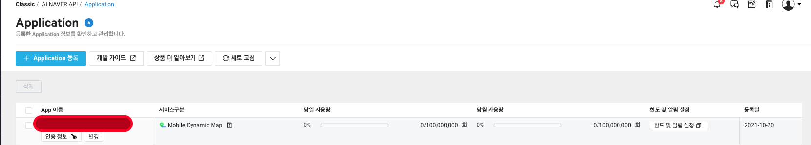 이제 아까 애플리케이션을 생성하기 전의 페이지에 가면 새로운 앱이 만들어져 있을 거예요