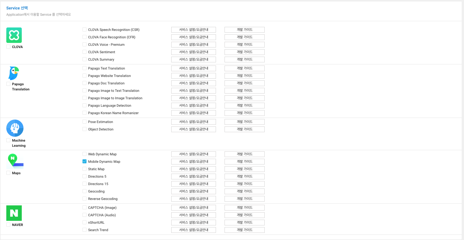https://console.ncloud.com/dashboard -> Products & Services -> AI Naver API를 클릭하면 아래와 같은 화면이 나오게 됩니다.